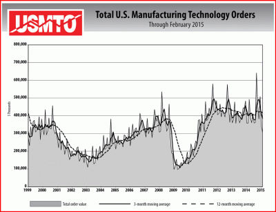 February U.S. manufacturing technology orders totaled $304.74 million according to The Association For Manufacturing Technology (AMT). This total, as reported by companies participating in the USMTO program, was down 10.6% from January’s $341.02 million and down 14.8% when compared with the total of $357.86 million reported for February 2014. With a year-to-date total of $645.76 million, 2015 was down 9.8% when compared with 2014.