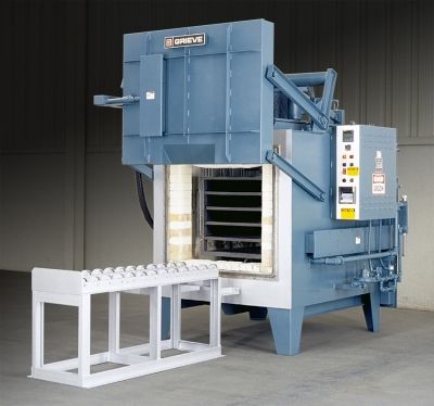 The unit is equipped with a roof-mounted heat-resisting alloy recirculating fan, powered by a 1-HP motor with V-belt drive, motor-operated vertical lift door, 100 lb. capacity alloy loading cart with cast alloy roller rails, 3-1/2” diameter cast alloy rollers and a roller rail loading table with 4” diameter cast iron rollers.