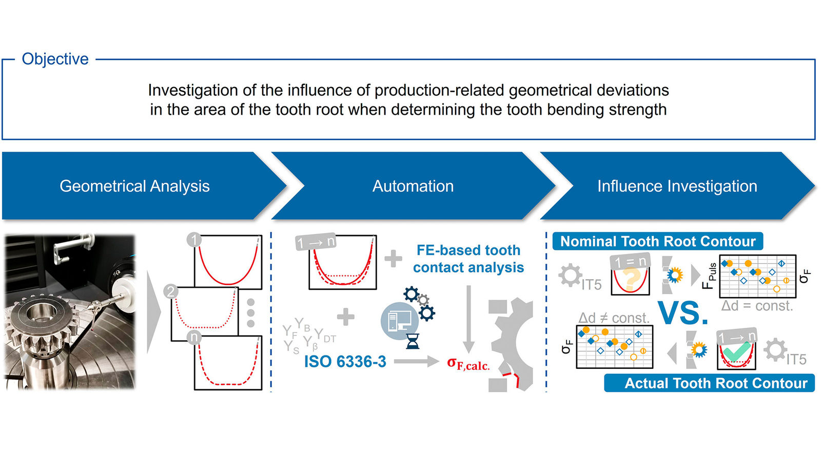 The first step is to measure the manufactured tooth gap contours—space between two adjacent teeth—and then analyze the production-related geometric deviations around the tooth root. In addition to recording manufacturing deviations due to tool wear and process variations, the analysis is also used to investigate the distortion in the tooth root area for different material and heat treatment combinations. Based on the geometry analysis, the tooth root stress calculation is automated, considering the measured tooth gap contours. This allows the calculation of actual tooth root stresses to be considered when performing and evaluating pulsator tests to determine the tooth bending strength. The automation includes both the stress calculation according to ISO 6336 3:2019 and the possibility to calculate the tooth root stresses using the FEA-based tooth contact analysis FE-STIRNRADKETTE (STIRAK) (Ref. 14). A uniform tooth root stress calculation procedure is required for the investigation of several variants with different production-related geometry deviations and is currently not sufficiently standardized to ensure comparability of the results and to avoid errors in the evaluation. The automated tooth root stress calculation is then used to investigate the influence of manufacturing geometry deviations on the tooth root stress and the effect on the determination of the tooth bending strength.