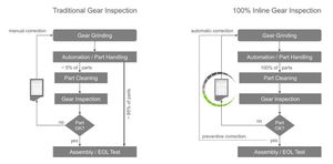 In conventional gear manufacturing, quality control is carried out for a number of pieces per batch. Most parts enter final gearbox assembly without any inspection. Among other things, this approach is based on two facts: measuring time is significantly longer than the machining time, and the limited measuring capacity available.