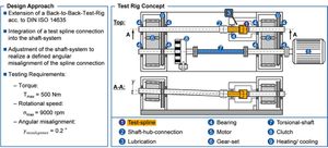 In the present paper, a spline-joint design and the extension of a back-to-back test rig were presented, which enable the testing of crowned spline-joints under high rotational speed, medium torque, high test temperature, and angular misalignments.