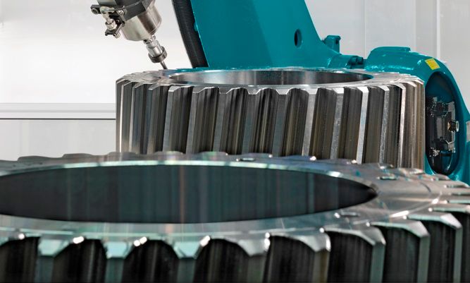 Figure 1: Using solid-carbide cutters, the robot provides the teeth with chamfers of up to 5 mm. It follows the involute contour of the tooth flanks exactly. Images by Kadia