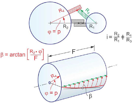 The different radii of pinion and gear flanks (p1 and p2) have to be oriented normal to the profile reference point, but with a larger gear radius value and a smaller pinion radius value (Fig. 4, left). Keeping the contacting point in the same initial profile location (Fig. 4, left) during an incremental pinion (and gear) rotation can only be realized with the introduction of a helix angle; the helix angle must be defined such that for a certain pinion rotation the profile rotates back to the initial position. Subsequently, the gear profile also has to rotate back into the initial position by an angular amount equal to the angle of the pinion rotation, divided by the ratio between the two members.