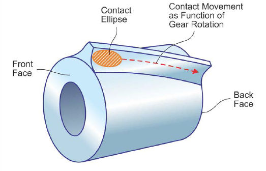 A simple example: A pitch angle of 24° and a contact ratio of 1.0. If the pinion is rotated by 24° and the initial contact at the profile reference point is located at the front face of the teeth, then the back rotation of the profile has to occur as the contact moves along the face width to the back face of the teeth.