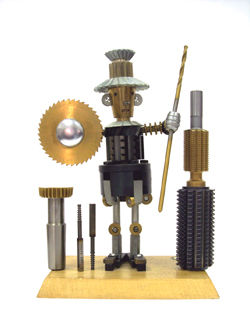 Toolman watched the activity at the expo from a prime tabletop position at Barit’s booth. Visitors were lured in by the mascot’s body, which includes hobs, cutting tools, carbide inserts, tapers, a drill, and milling cutters.