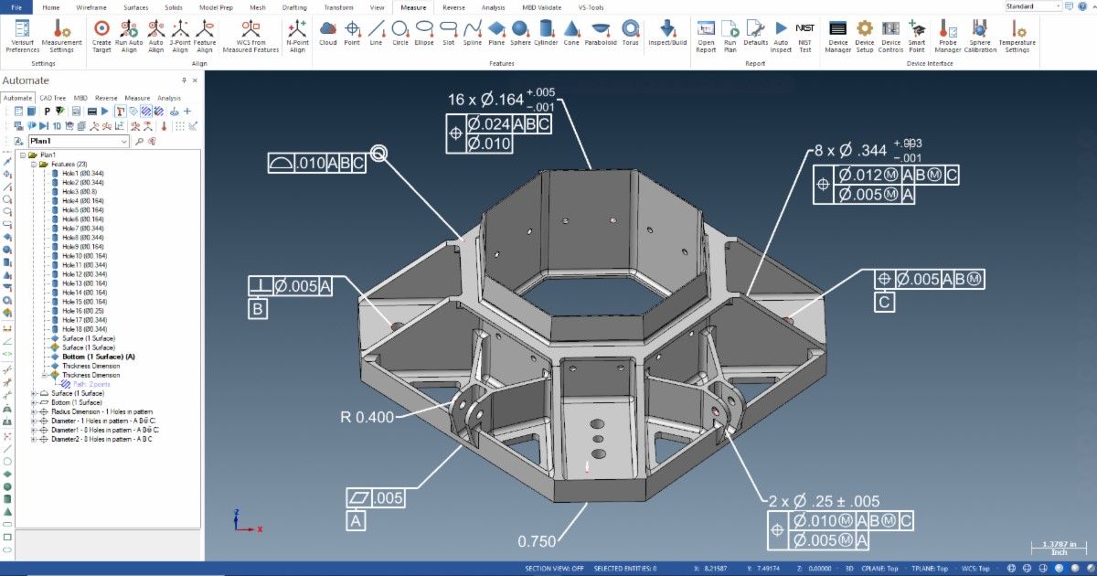 Verisurf software is built on a CAD platform and is committed to Model-Based Definition (MBD). Verisurf 2023 takes this a step further with automatic conversion of 3D CAD annotations into MBD and intelligent Geometric Dimensioning & Tolerancing (GD&T). This new automatic feature will further reduce the time needed to set up inspection plans, reduce input errors, and increase process control.
